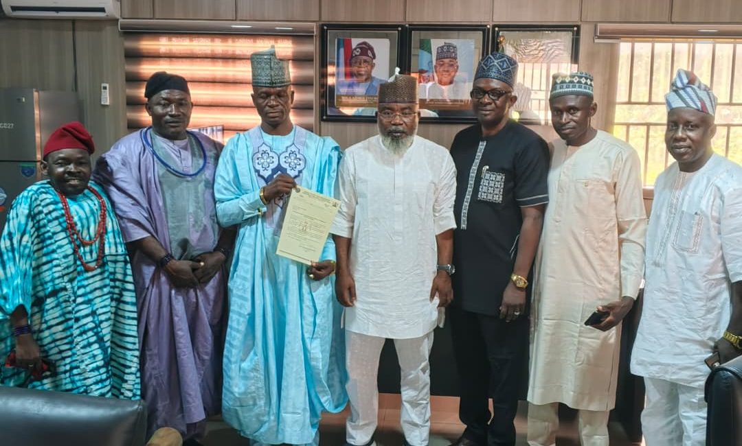 The Commissioner for Local Government and Chieftaincy Affairs, Barr Salami Momodu Ozigi Deedat presents appointment letter to HRH, Alh. Ibrahim Amodu Ejah, the Atamodu of Odu and