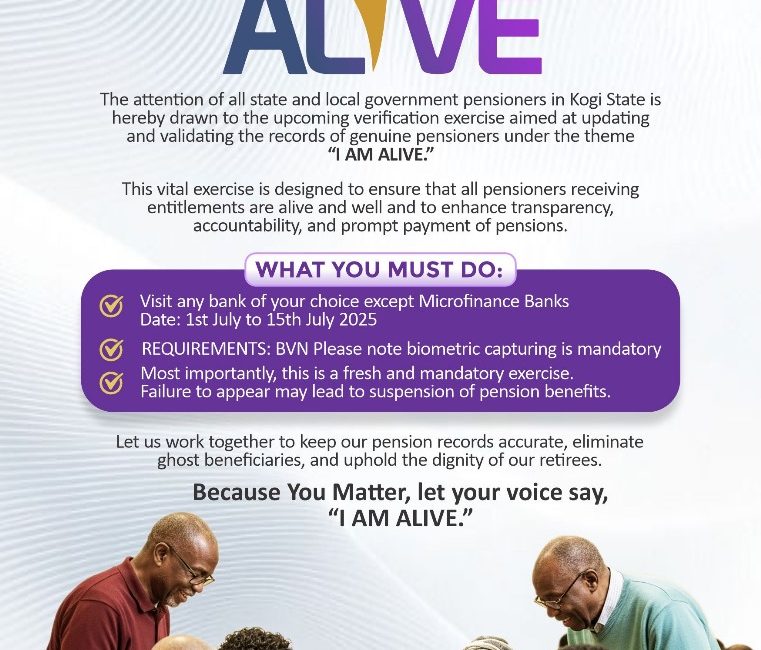 The attention of all state and local government pensioners in Kogi State is hereby drawn to the upcoming verification exercise aimed at updating and validating the records of genuine pensioners under the theme “I AM ALIVE.”